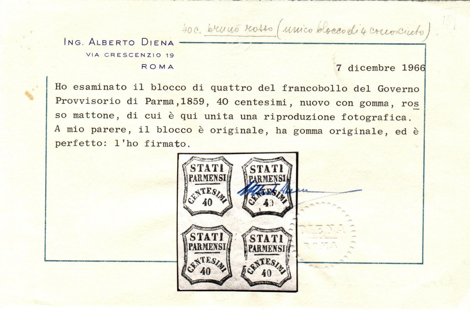 PARMA - Governo Provvisorio 40 c. rosso mattone, blocco di 4 esemplari nuovo di cui i 2 es. inferiori senza traccia di linguella (16). Molto fresco e ben conservato. Massimo blocco conosciuto. Rarità di prima grandezza per grande collezione. Ex Barcella. Altissimo valore di catalogo.